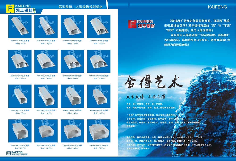 凯丰铝材以其优良的品质,良好的综合性能和周到的服务,赢得了广大客户和社会各界的青睐。为工业自动化设备、机械防护设备、广告、装饰领域提供广阔的设计空间。公司持续的质量改进作为企业的永恒目标,形成以“勤奋改变世界、诚信赢得世界、品质提升世界、服务感动世界、科技创造世界、竟博挑战世界、智慧征服世界”具有凯丰嘉特色的企业文化,使公司具有强大的凝聚力和发展后劲。